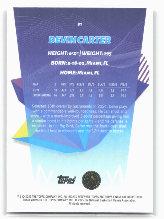 This is a nice example of a 2024-25 Finest #81 Devin Carter Geometric Other important information about this card:RCIn 2024 Devin Carter played for the Sacramento Kings.Please check out our...