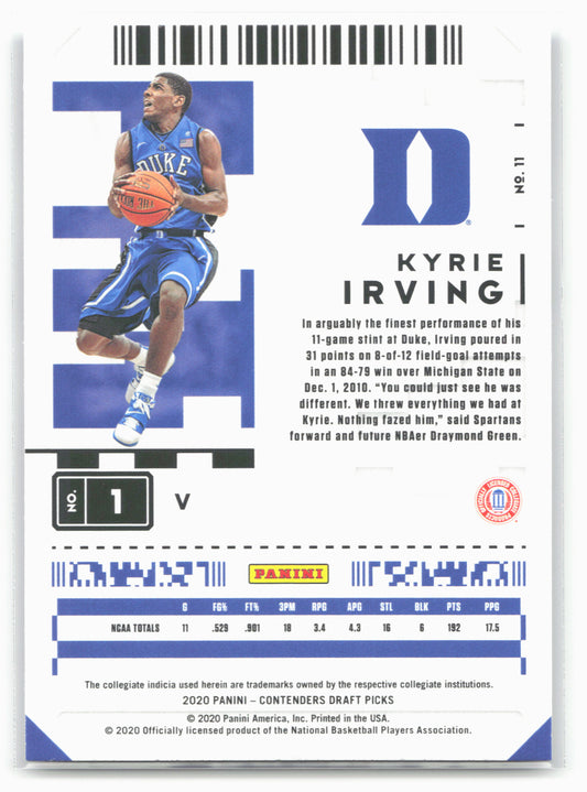 This is a nice example of a 2020 Panini Contenders Draft Picks #11b Kyrie Irving Campus Ticket Other important information about this card:In 2020 Kyrie Irving played for the Duke...