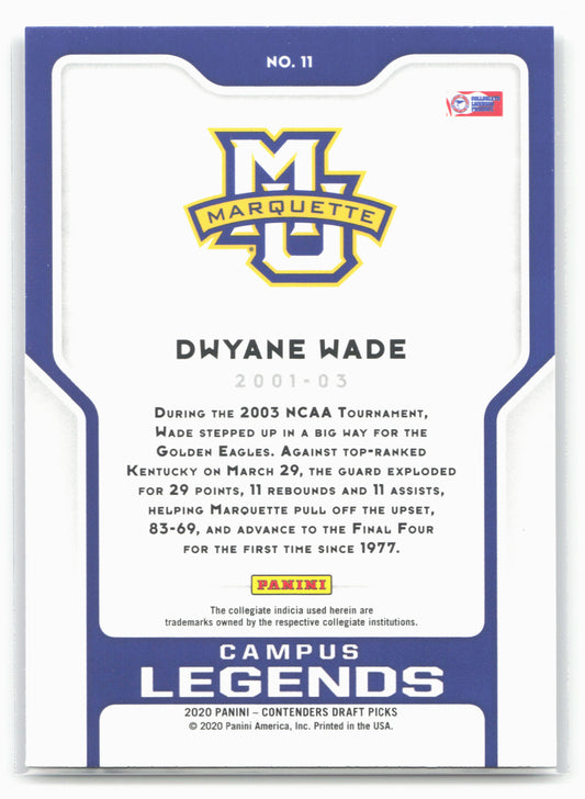 This is a nice example of a 2020 Panini Contenders Draft Picks #11 Dwyane Wade Campus Legends Other important information about this card:In 2020 Dwyane Wade played for the Marquette...
