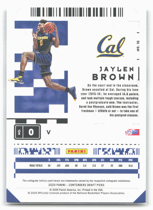 This is a nice example of a 2020 Panini Contenders Draft Picks #10b Jaylen Brown Other important information about this card:Blue jerseyIn 2020 Jaylen Brown played for the California Golden...