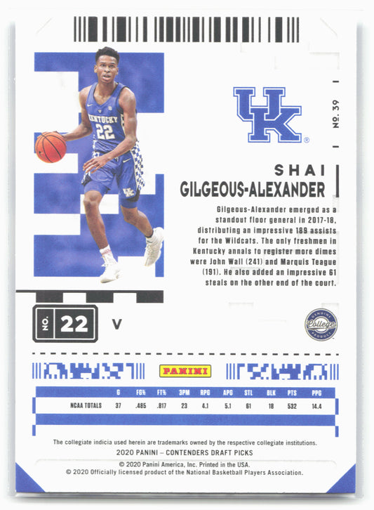 This is a nice example of a 2020 Panini Contenders Draft Picks #39b Shai Gilgeous-Alexander Other important information about this card:In 2020 Shai Gilgeous-Alexander played for the Kentucky Wildcats.Please check...