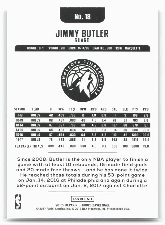 This is a nice example of a 2017-18 Hoops #18 Jimmy Butler Other important information about this card:In 2017 Jimmy Butler played for the Minnesota Timberwolves.Please check out our other...