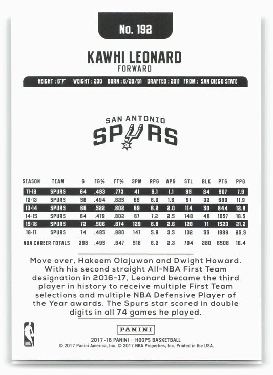 This is a nice example of a 2017-18 Hoops #192 Kawhi Leonard Other important information about this card:In 2017 Kawhi Leonard played for the San Antonio Spurs.Please check out our...