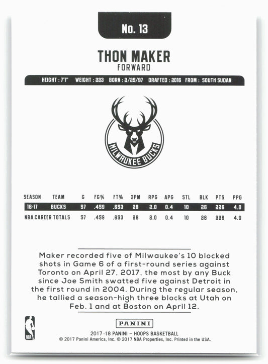 This is a nice example of a 2017-18 Hoops #13 Thon Maker Other important information about this card:In 2017 Thon Maker played for the Milwaukee Bucks.Please check out our other...