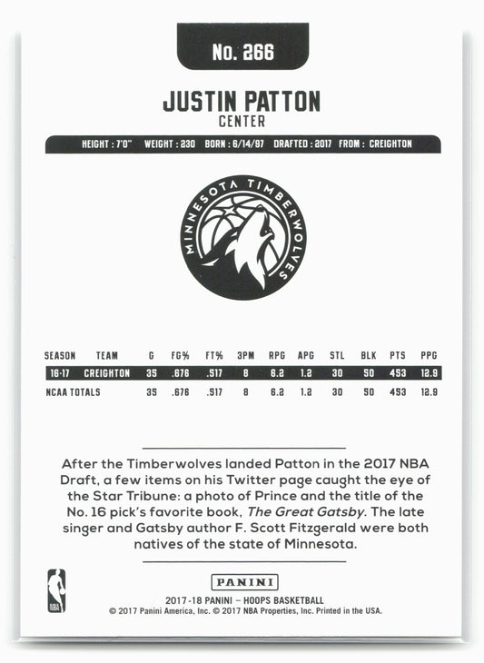 This is a nice example of a 2017-18 Hoops #266 Justin Patton Other important information about this card:RCIn 2017 Justin Patton played for the Minnesota Timberwolves.Please check out our other...