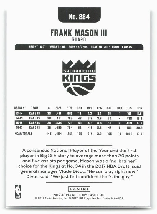 This is a nice example of a 2017-18 Hoops #284 Frank Mason III Other important information about this card:RCIn 2017 Frank Mason III played for the Sacramento Kings.Please check out...