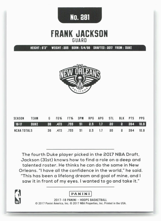 This is a nice example of a 2017-18 Hoops #281 Frank Jackson Other important information about this card:RCIn 2017 Frank Jackson played for the New Orleans Pelicans.Please check out our...