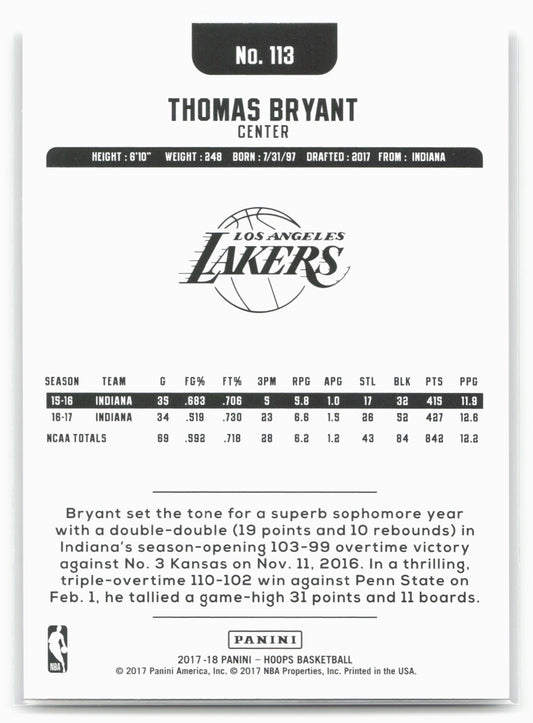 This is a nice example of a 2017-18 Hoops #113 Thomas Bryant Other important information about this card:RCIn 2017 Thomas Bryant played for the Los Angeles Lakers.Please check out our...