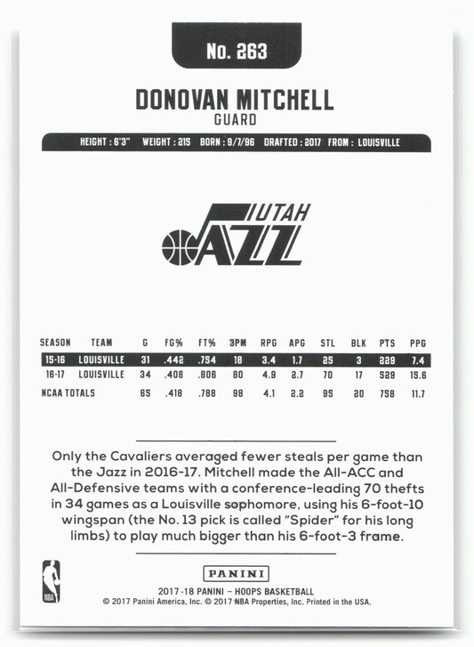 This is a nice example of a 2017-18 Hoops #263 Donovan Mitchell Other important information about this card:RCIn 2017 Donovan Mitchell played for the Utah Jazz.Please check out our other...