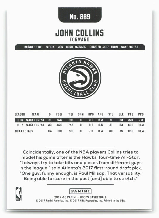 This is a nice example of a 2017-18 Hoops #269 John Collins Other important information about this card:RCIn 2017 John Collins played for the Atlanta Hawks.Please check out our other...