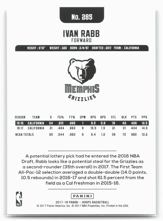 This is a nice example of a 2017-18 Hoops #285 Ivan Rabb Other important information about this card:RCIn 2017 Ivan Rabb played for the Memphis Grizzlies.Please check out our other...