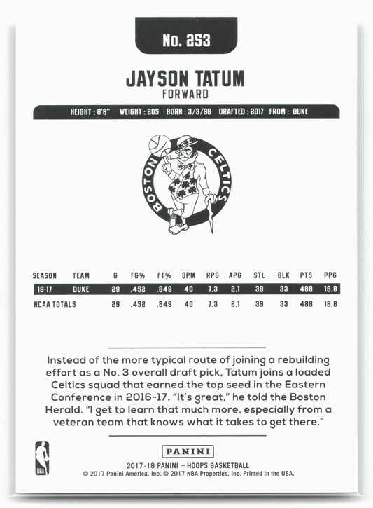 This is a nice example of a 2017-18 Hoops #253 Jayson Tatum Other important information about this card:RCIn 2017 Jayson Tatum played for the Boston Celtics.Please check out our other...