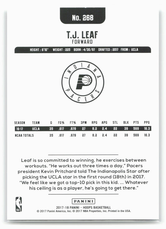 This is a nice example of a 2017-18 Hoops #268 T.J. Leaf Other important information about this card:RCIn 2017 T.J. Leaf played for the Indiana Pacers.Please check out our other...