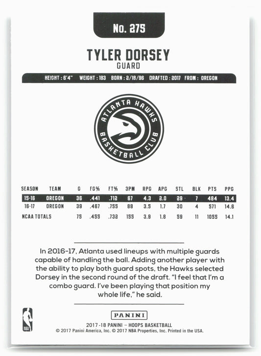 This is a nice example of a 2017-18 Hoops #275 Tyler Dorsey Other important information about this card:RCIn 2017 Tyler Dorsey played for the Atlanta Hawks.Please check out our other...