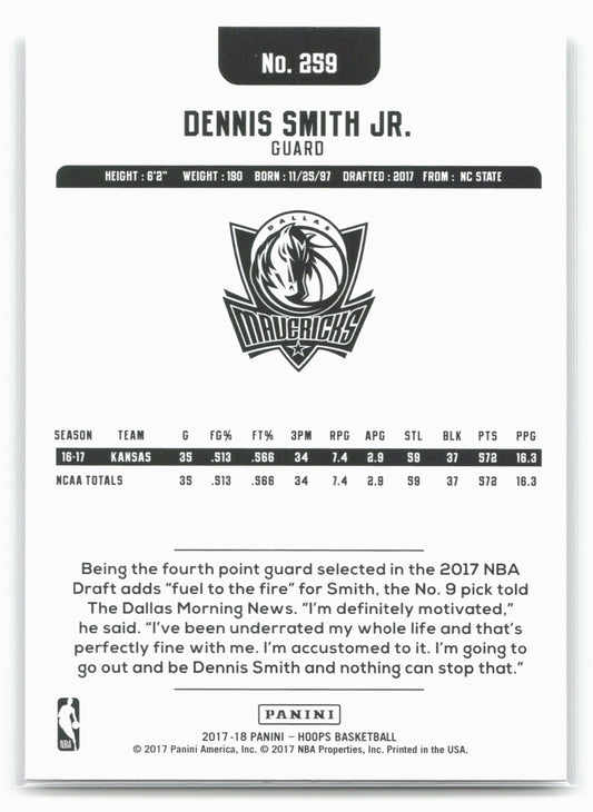 This is a nice example of a 2017-18 Hoops #259 Dennis Smith Jr. Other important information about this card:RCIn 2017 Dennis Smith Jr. played for the Dallas Mavericks.Please check out...