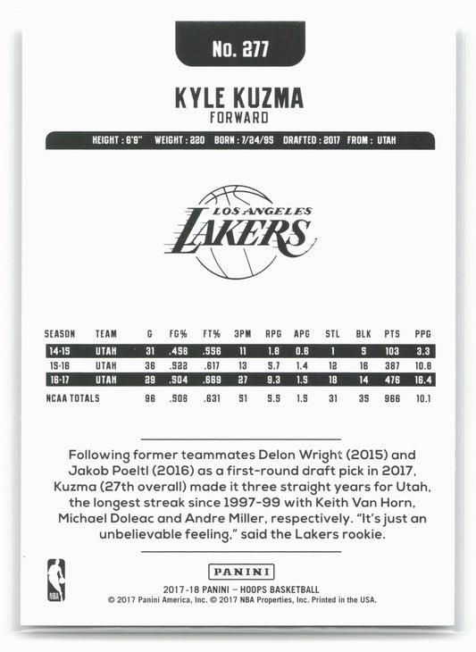 This is a nice example of a 2017-18 Hoops #277 Kyle Kuzma Other important information about this card:RCIn 2017 Kyle Kuzma played for the Los Angeles Lakers.Please check out our...
