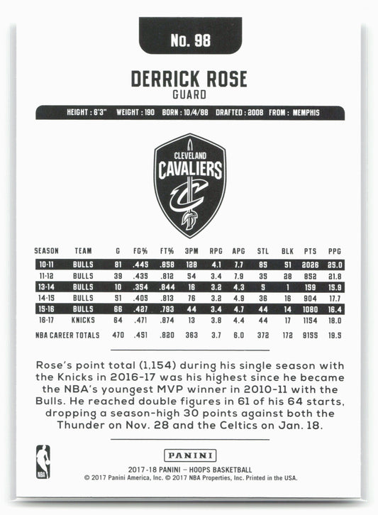 This is a nice example of a 2017-18 Hoops #98 Derrick Rose Other important information about this card:In 2017 Derrick Rose played for the Cleveland Cavaliers.Please check out our other...