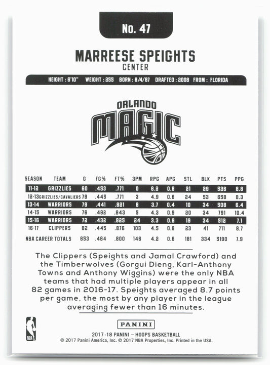 This is a nice example of a 2017-18 Hoops #47 Marreese Speights Other important information about this card:In 2017 Marreese Speights played for the Orlando Magic.Please check out our other...
