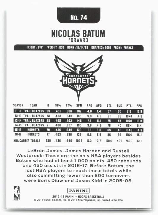 This is a nice example of a 2017-18 Hoops #74 Nicolas Batum Other important information about this card:In 2017 Nicolas Batum played for the Charlotte Hornets.Please check out our other...