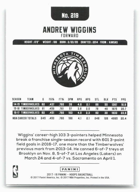 This is a nice example of a 2017-18 Hoops #219 Andrew Wiggins Other important information about this card:In 2017 Andrew Wiggins played for the Minnesota Timberwolves.Please check out our other...