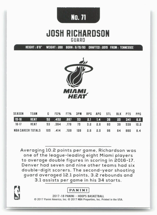 This is a nice example of a 2017-18 Hoops #71 Josh Richardson Other important information about this card:In 2017 Josh Richardson played for the Miami Heat.Please check out our other...