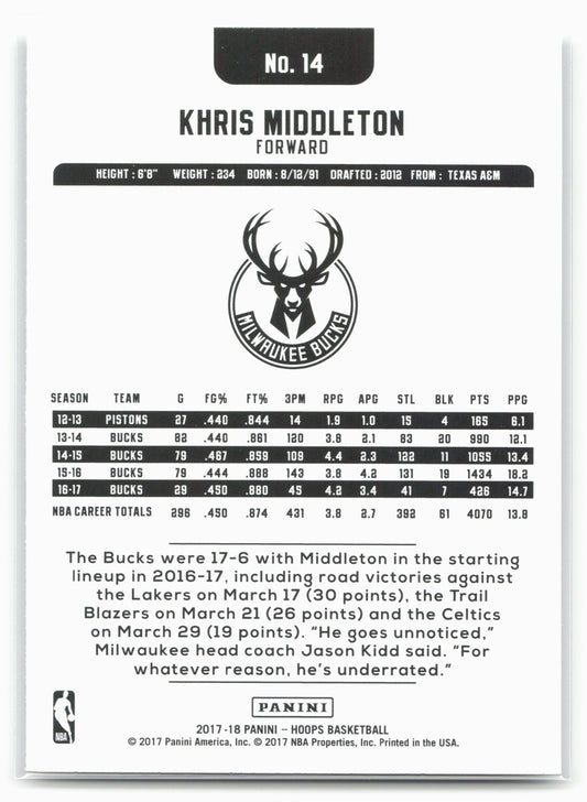 This is a nice example of a 2017-18 Hoops #14 Khris Middleton Other important information about this card:In 2017 Khris Middleton played for the Milwaukee Bucks.Please check out our other...