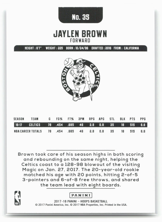 This is a nice example of a 2017-18 Hoops #35 Jaylen Brown Other important information about this card:In 2017 Jaylen Brown played for the Boston Celtics.Please check out our other...