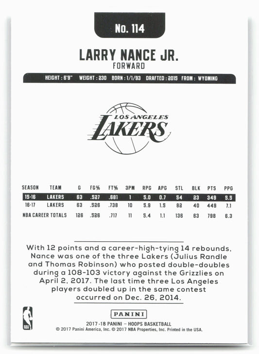 This is a nice example of a 2017-18 Hoops #114 Larry Nance Jr. Other important information about this card:In 2017 Larry Nance Jr. played for the Los Angeles Lakers.Please check...