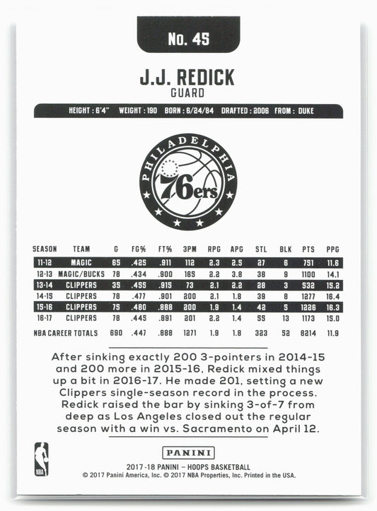 This is a nice example of a 2017-18 Hoops #45 J.J. Redick Other important information about this card:In 2017 J.J. Redick played for the Philadelphia 76ers.Please check out our other...