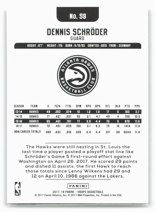 This is a nice example of a 2017-18 Hoops #59 Dennis Schroder Other important information about this card:In 2017 Dennis Schroder played for the Atlanta Hawks.Please check out our other...