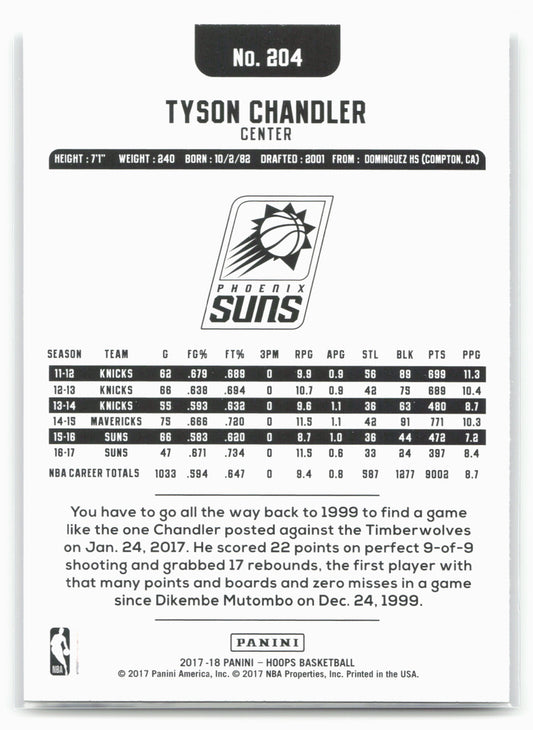 This is a nice example of a 2017-18 Hoops #204 Tyson Chandler Other important information about this card:In 2017 Tyson Chandler played for the Phoenix Suns.Please check out our other...