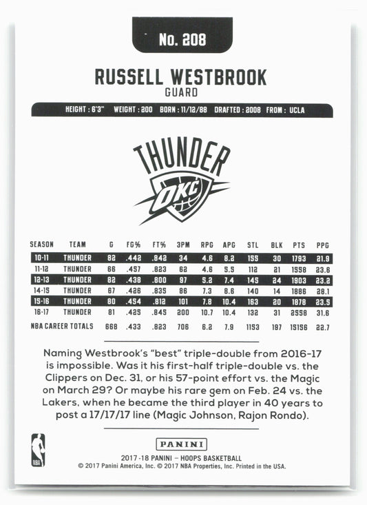 This is a nice example of a 2017-18 Hoops #208 Russell Westbrook Other important information about this card:In 2017 Russell Westbrook played for the Oklahoma City Thunder.Please check out our...