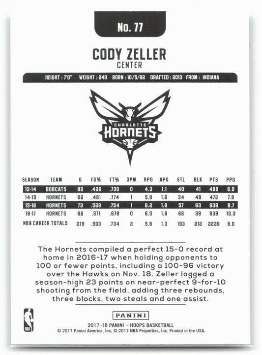 This is a nice example of a 2017-18 Hoops #77 Cody Zeller Other important information about this card:In 2017 Cody Zeller played for the Charlotte Hornets.Please check out our other...