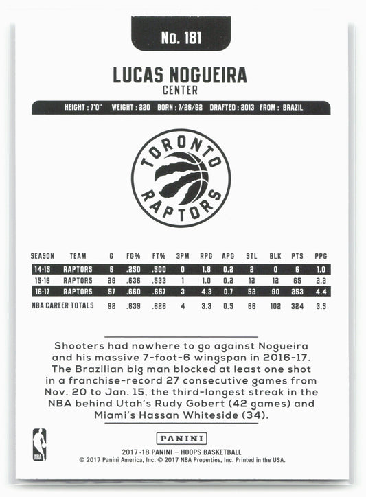 This is a nice example of a 2017-18 Hoops #181 Lucas Nogueira Other important information about this card:In 2017 Lucas Nogueira played for the Toronto Raptors.Please check out our other...
