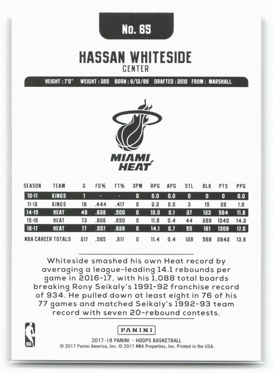 This is a nice example of a 2017-18 Hoops #65 Hassan Whiteside Other important information about this card:In 2017 Hassan Whiteside played for the Miami Heat.Please check out our other...