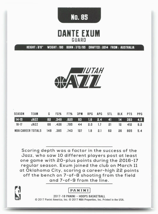 This is a nice example of a 2017-18 Hoops #85 Dante Exum Other important information about this card:In 2017 Dante Exum played for the Utah Jazz.Please check out our other...