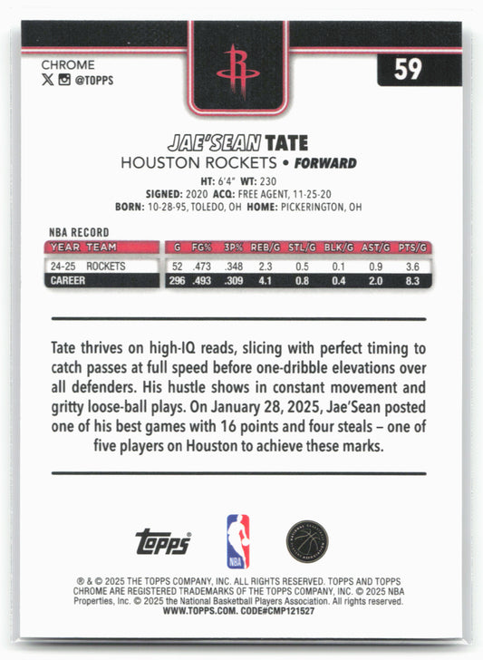 This is a nice example of a 2025-26 Topps Chrome #59 Jae'Sean Tate Other important information about this card:In 2025 Jae'Sean Tate played for the Houston Rockets.Please check out our...