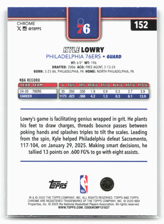 This is a nice example of a 2025-26 Topps Chrome #152 Kyle Lowry Other important information about this card:In 2025 Kyle Lowry played for the Philadelphia 76ers.Please check out our...