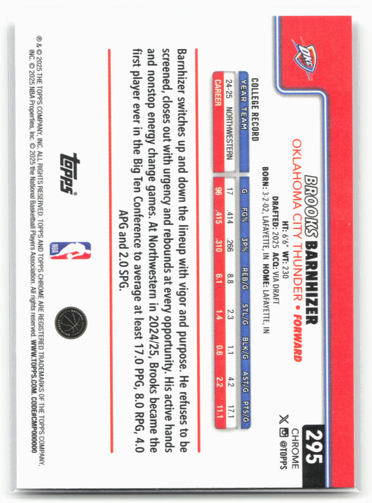 This is a nice example of a 2025-26 Topps Chrome #295 Brooks Barnhizer Other important information about this card:RCIn 2025 Brooks Barnhizer played for the Oklahoma City Thunder.Please check out...