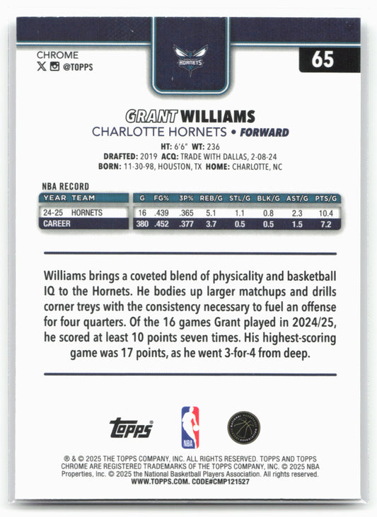 This is a nice example of a 2025-26 Topps Chrome #65 Grant Williams Other important information about this card:In 2025 Grant Williams played for the Charlotte Hornets.Please check out our...