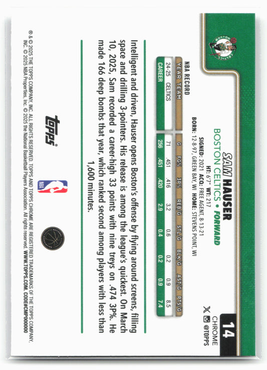 This is a nice example of a 2025-26 Topps Chrome #14 Sam Hauser Other important information about this card:In 2025 Sam Hauser played for the Boston Celtics.Please check out our...