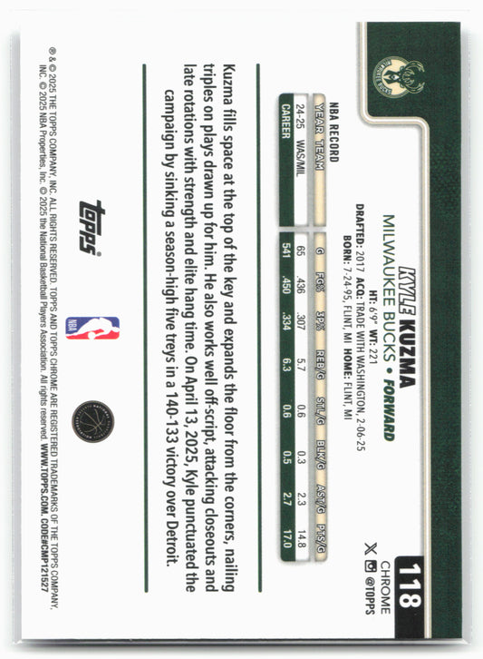 This is a nice example of a 2025-26 Topps Chrome #118 Kyle Kuzma Other important information about this card:In 2025 Kyle Kuzma played for the Milwaukee Bucks.Please check out our...