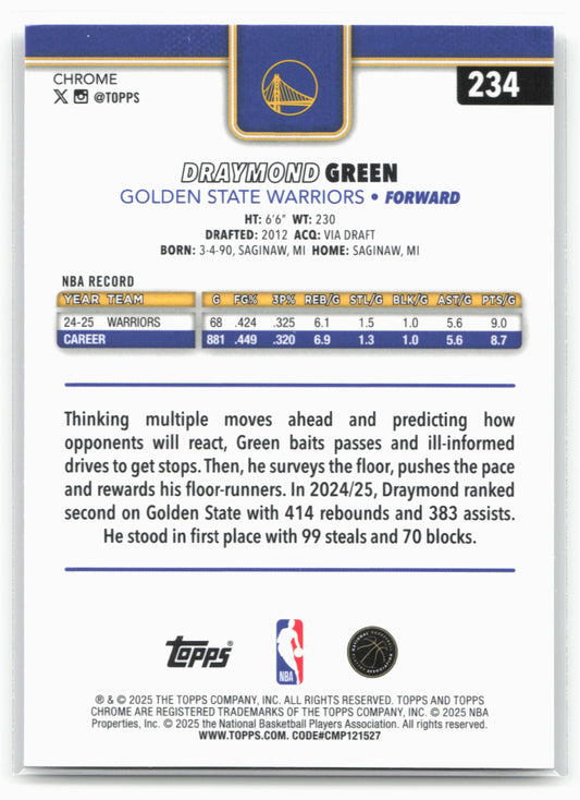This is a nice example of a 2025-26 Topps Chrome #234 Draymond Green Other important information about this card:In 2025 Draymond Green played for the Golden State Warriors.Please check out...