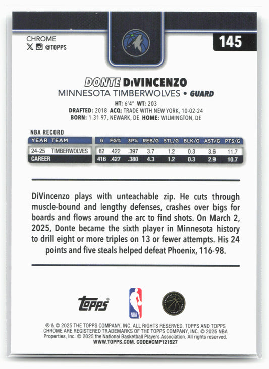 This is a nice example of a 2025-26 Topps Chrome #145 Donte DiVincenzo Other important information about this card:In 2025 Donte DiVincenzo played for the Minnesota Timberwolves.Please check out our...