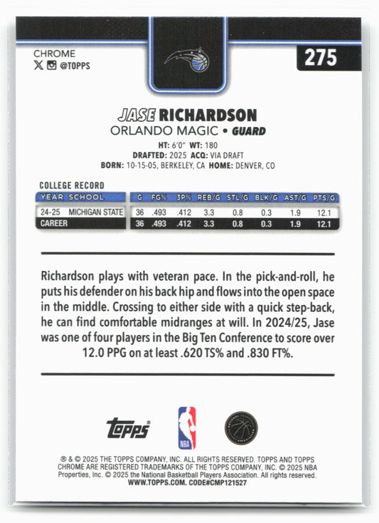 This is a nice example of a 2025-26 Topps Chrome #275 Jase Richardson Other important information about this card:RCIn 2025 Jase Richardson played for the Orlando Magic.Please check out our...