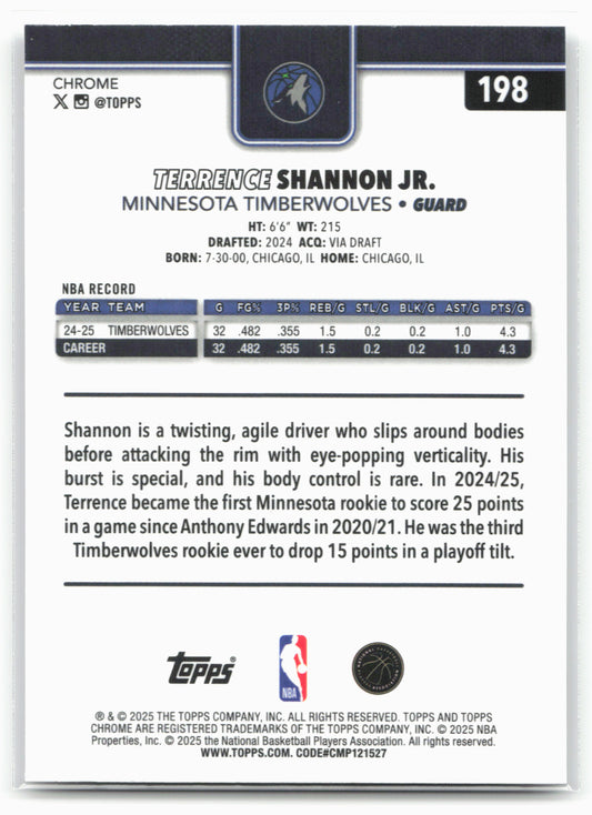 This is a nice example of a 2025-26 Topps Chrome #198 Terrence Shannon Jr. Other important information about this card:In 2025 Terrence Shannon Jr. played for the Minnesota Timberwolves.Please check...
