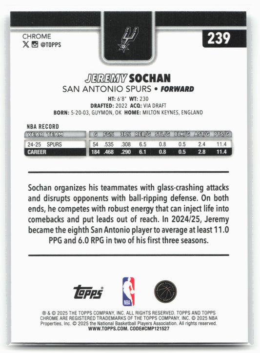 This is a nice example of a 2025-26 Topps Chrome #239 Jeremy Sochan Other important information about this card:In 2025 Jeremy Sochan played for the San Antonio Spurs.Please check out...