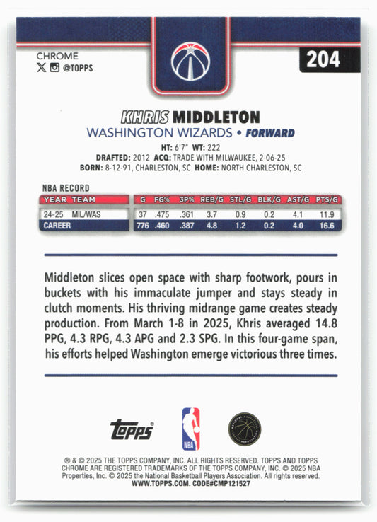 This is a nice example of a 2025-26 Topps Chrome #204 Khris Middleton Other important information about this card:In 2025 Khris Middleton played for the Washington Wizards.Please check out our...