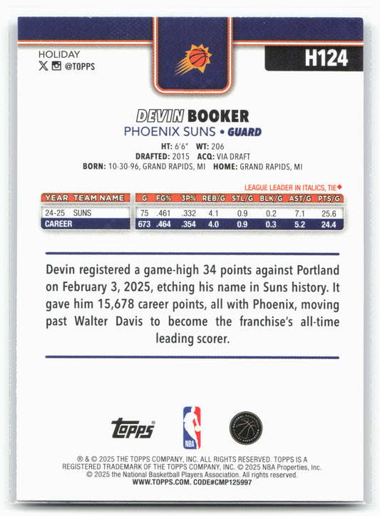This is a nice example of a 2025-26 Topps Holiday #H124 Devin Booker Blue Metallic Glitter Holiday Other important information about this card:In 2025 Devin Booker played for the Phoenix...