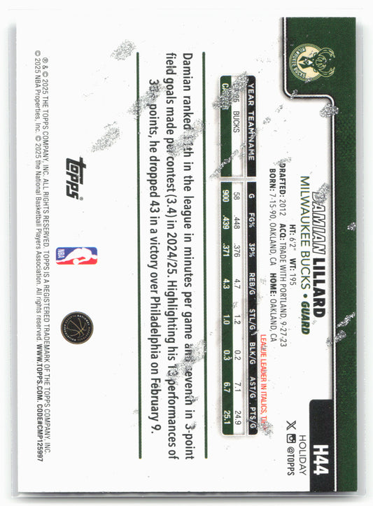 This is a nice example of a 2025-26 Topps Holiday #H44 Damian Lillard Glitter Holiday Other important information about this card:25125In 2025 Damian Lillard played for the Milwaukee Bucks.Please check...